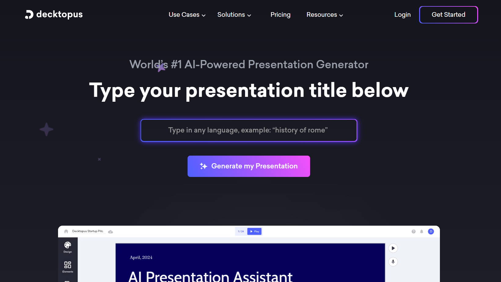 Decktopus AI是全球排名第一的AI驱动演示文稿生成器,它通过强大的人工智能技术帮助用户节省时间,提高演示文稿的制作效率。
