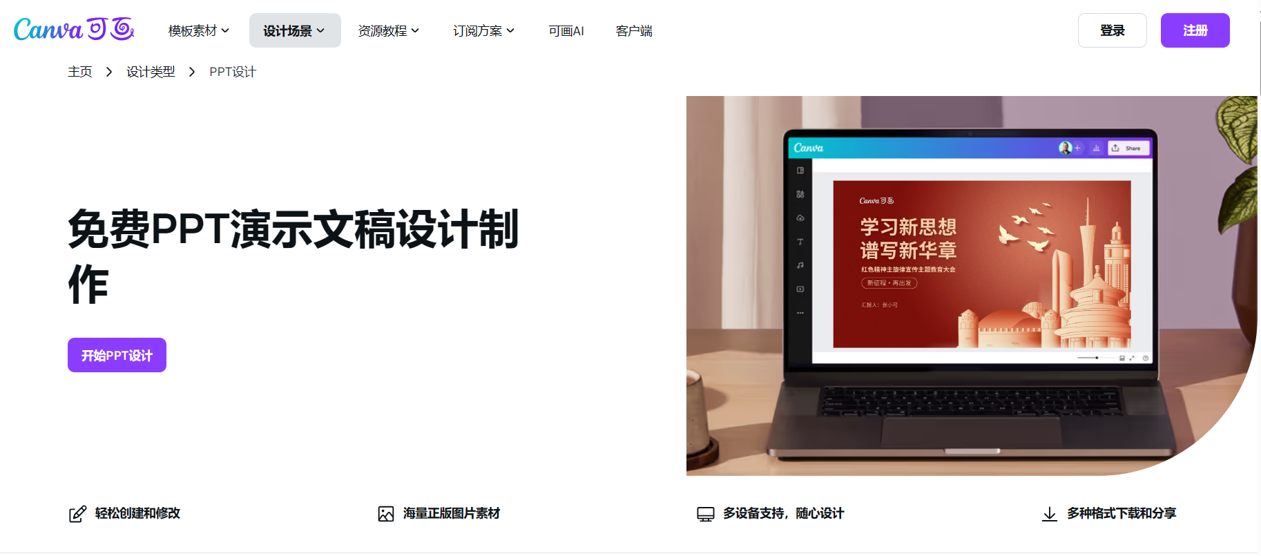 Canva可画是一个在线平台,它提供广泛的自定义选项和模板,使用户能够轻松创建适用于不同场景的演示文稿。