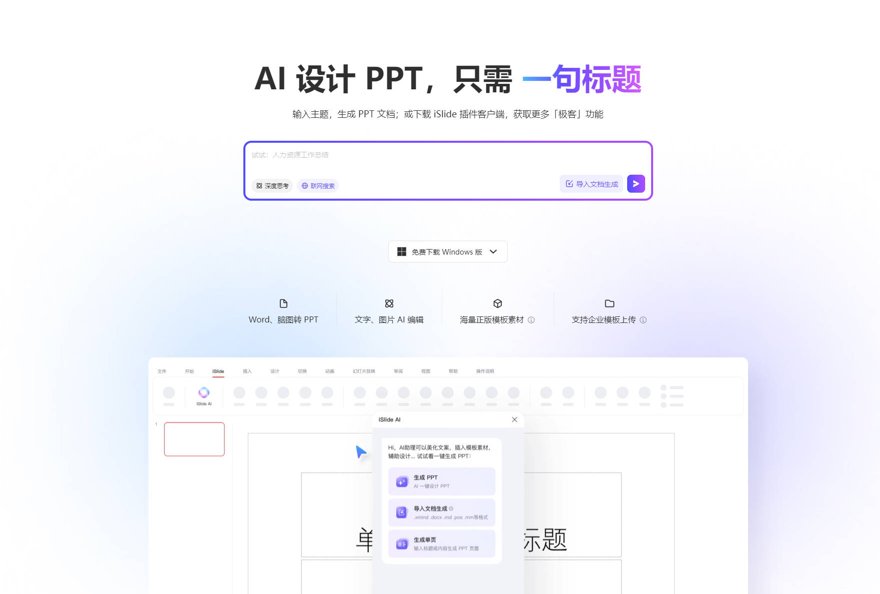 iSlide是一款AI一键生成PPT的AI制作PPT神器,新人免费限时体验,是业内知名的AI驱动PPT效率工具,7年口碑,海内外累积 3000W用户。