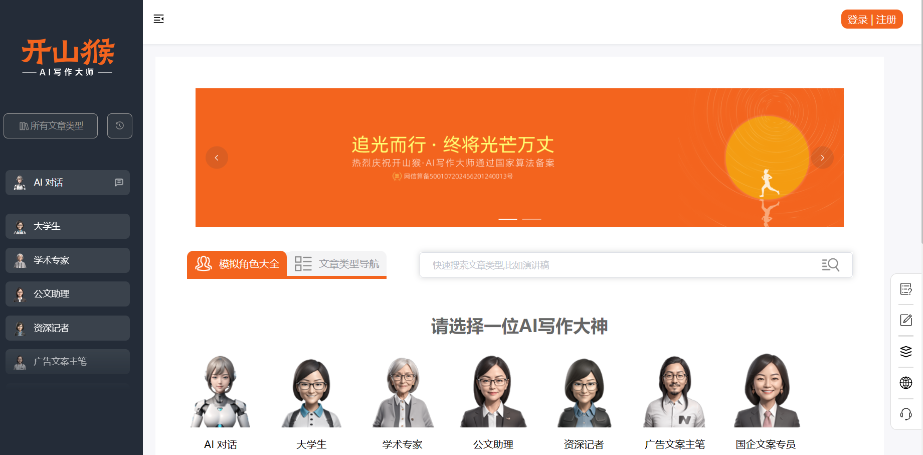 开山猴AI写作大师是一个自主研发的人工智能写作平台,旨在通过高级的AI技术满足用户的各类创作需求,简化写作流程,提高写作效率。
